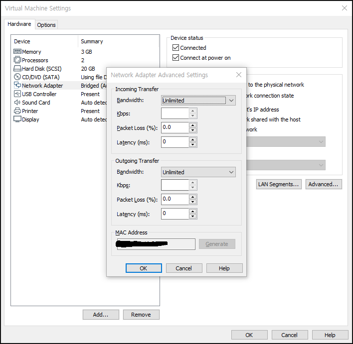 첫 번째 문제를 해결하기 위하여 현재 VM을 종료하고 아래와 같이 Generate를 눌러 MAC 주소를 변경한다
