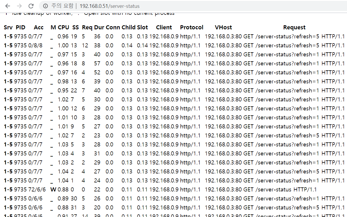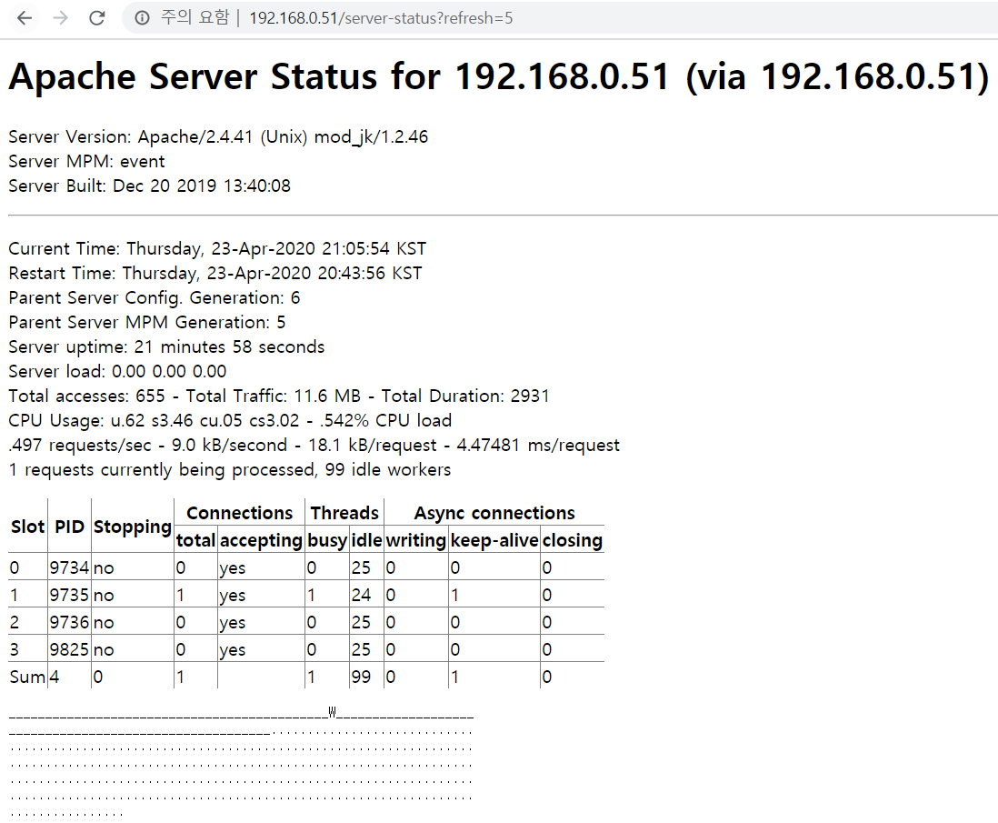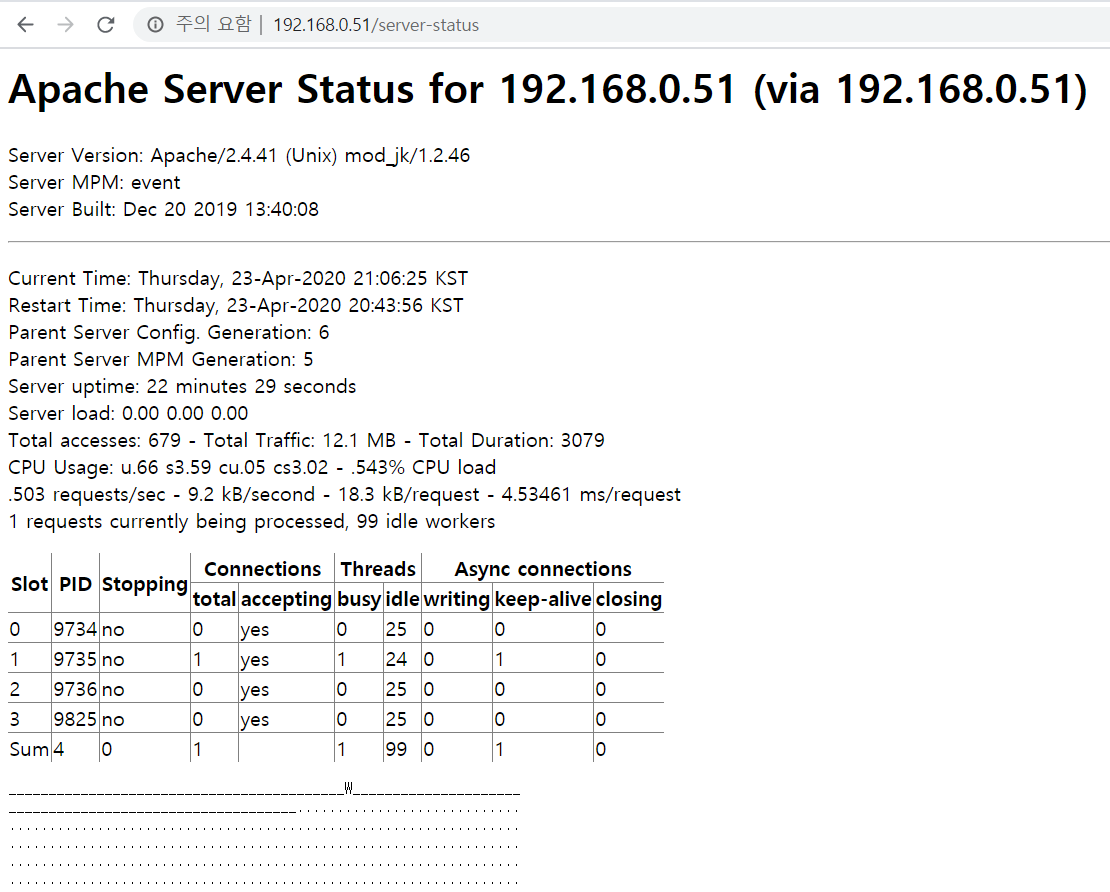 그럼 브라우저에서 "server-status" 핸들러를 호출하여 동작 상황을 보자