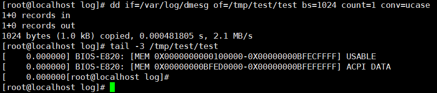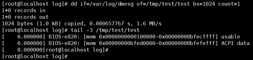 # /var/log/dmesg의 내용을 읽고 /tmp/test/test파일에 쓰는것을 1024바이트 크기로 1번 반복한다.