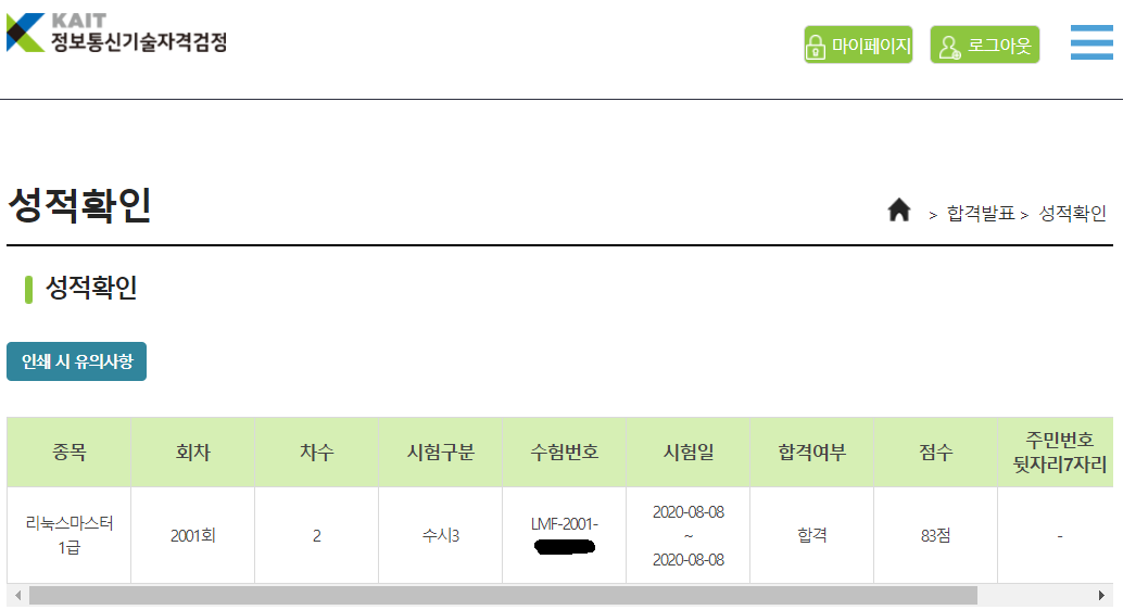 사진에 보이듯 83점 무난한 점수로 합격하였다.