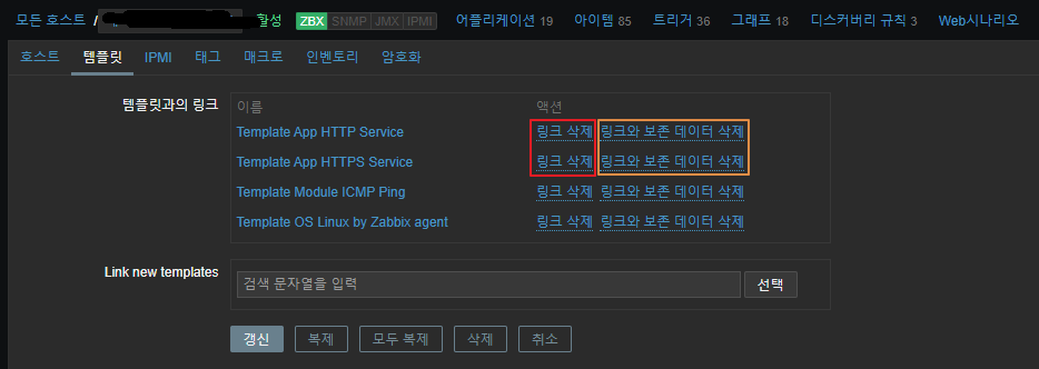 해당 호스트에 템플릿으로 들어오면 아래 사진과 같이 [링크삭제], [링크와 보존 데이터 삭제] 2가지가 있습니다.
